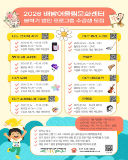 [배방어울림문화센터] 2026 봄학기 법인 프로그램 수강생 모집📅 신청기간 : 2026.02.09(월) ~ 02.13(금)✅ 운영기간 : 202…