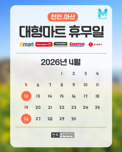 2026년 4월 천안·아산 대형마트 휴무일📅 2026년 4월 천안·아산 대형마트 휴무 안내❌ 4월 12일(일) : 둘째 일요일❌ 4월 26일(일…