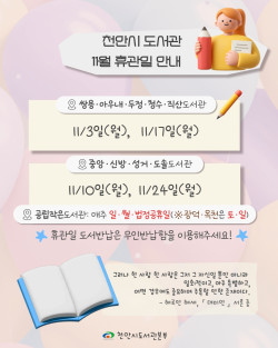 천안시 도서관 11월 휴관일 안내✅ 쌍용, 아우내, 두정, 청수, 직산도서관- 11월 3일(월) *정기휴관일- 11월 17일(월) *정기휴관일✅…