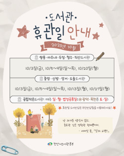 천안시 도서관 10월 휴관일 안내✅ 쌍용, 아우내, 두정, 청수, 직산도서관- 10월 3일(월) *개천절- 10월 5일~9일(일~목) *추석연휴…