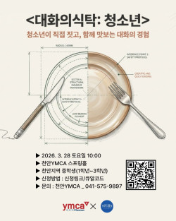 [천안YMCA] 대화의식탁 with 청소년, 참가자 모집📅 일시 : 2026. 3. 28 토요일 10:00 ~13:00📍 장소 : 천안YMCA …