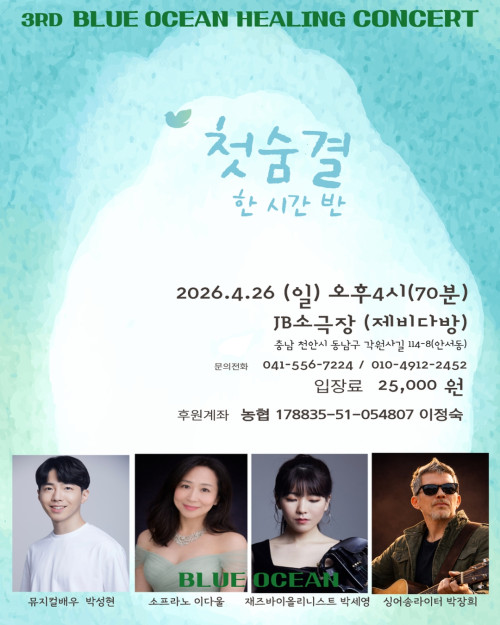 [힐링 콘서트] 첫숨결 한 시간 반 📅 일시 : 2026.04.26 (일) 오후4시(70분) 📍 장소 : JB소극장 (제비다방) / 천안시 동남구 각원사길 114-8(안서동…