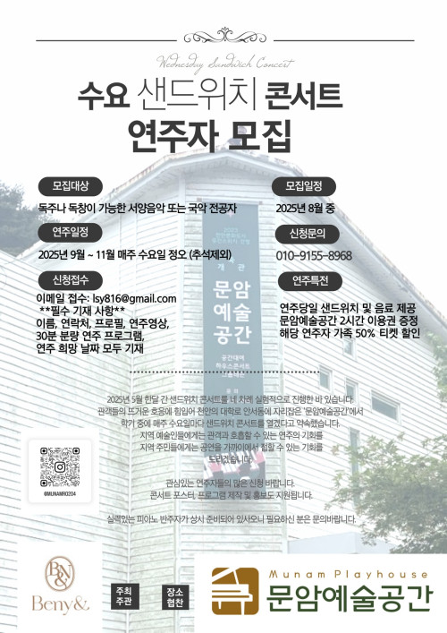 [문암예술공간] 수요 샌드위치 콘서트 연주자 모집 ✅ 대상 : 독주나 독창이…